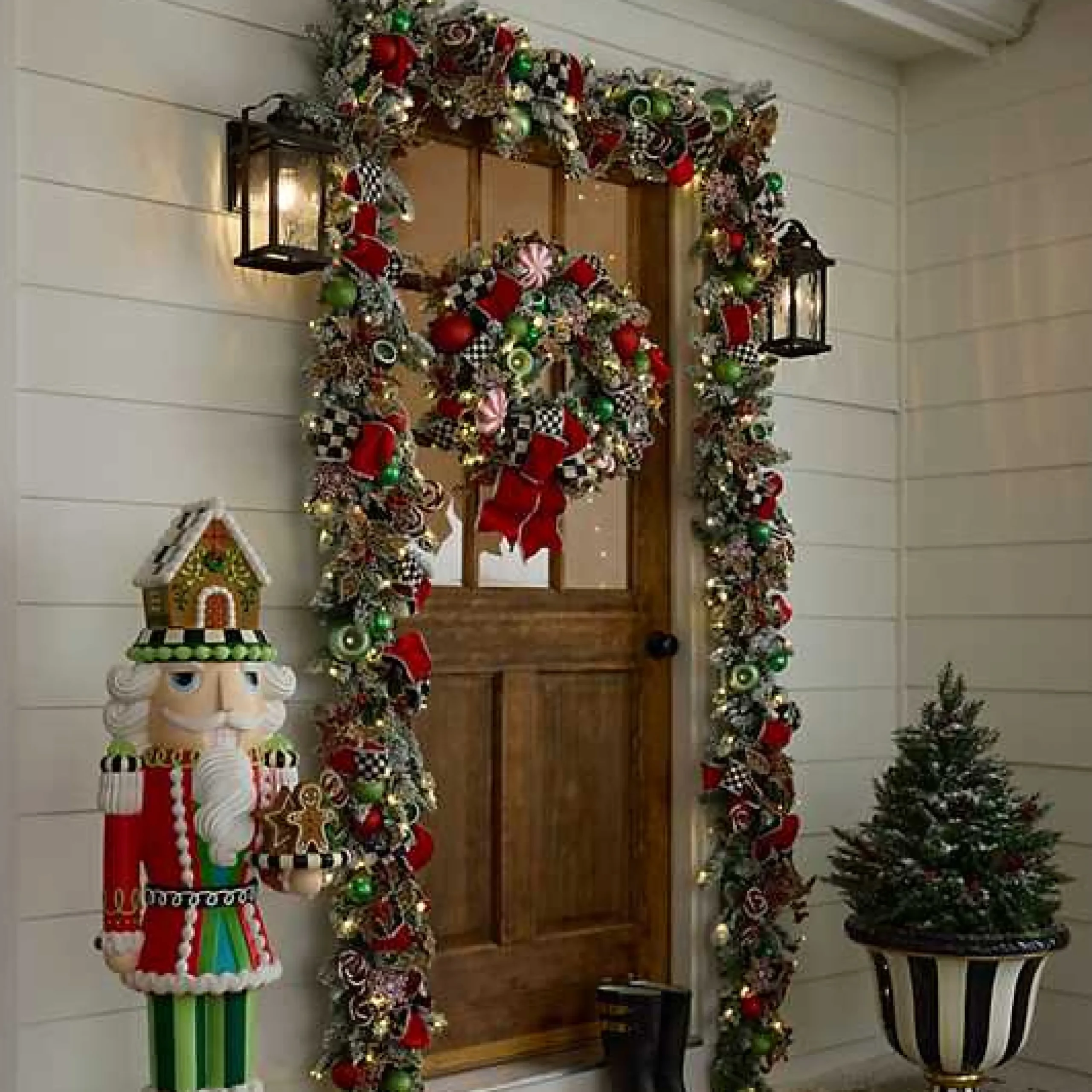 Deck the halls, the staircase, or the mantel with this illuminated garland, featuring everlasting flocked pine boughs, burlap holly leaves, faux gingerbread cookies and sweets, and shatter-resistant ornaments. Itrsquo;s finished with velvet ribbon, backed with Courtly Checkreg;, and edged with silver tinsel. MacKenzie-Childs