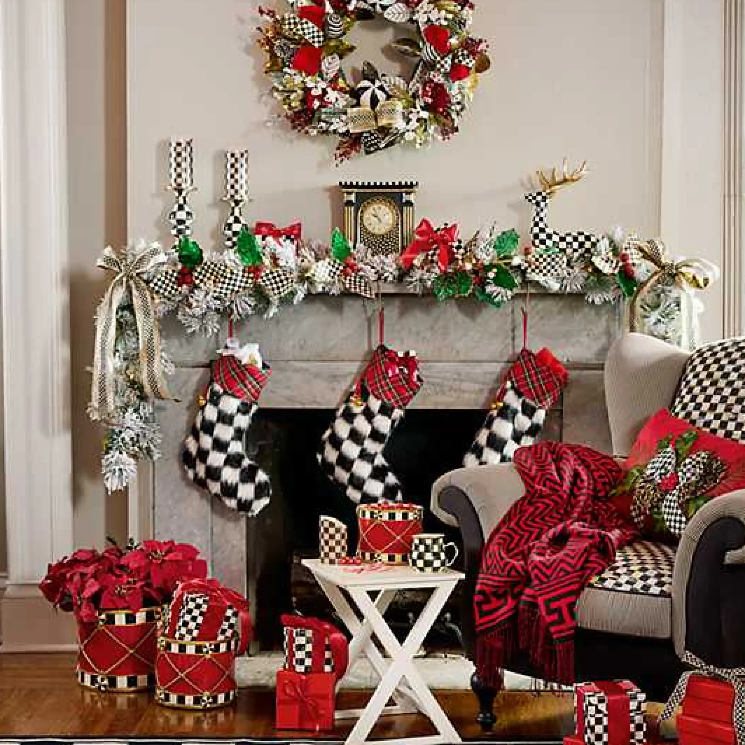 Check the halls with our Checkmate collection. The Sitting Checkmate Deer is adorned in hand-painted Courtly Checkreg; with gold leaf on its antlers, ears, and hooves. Place it on a tabletop or a mantel to add a regal golden touch. MacKenzie-Childs