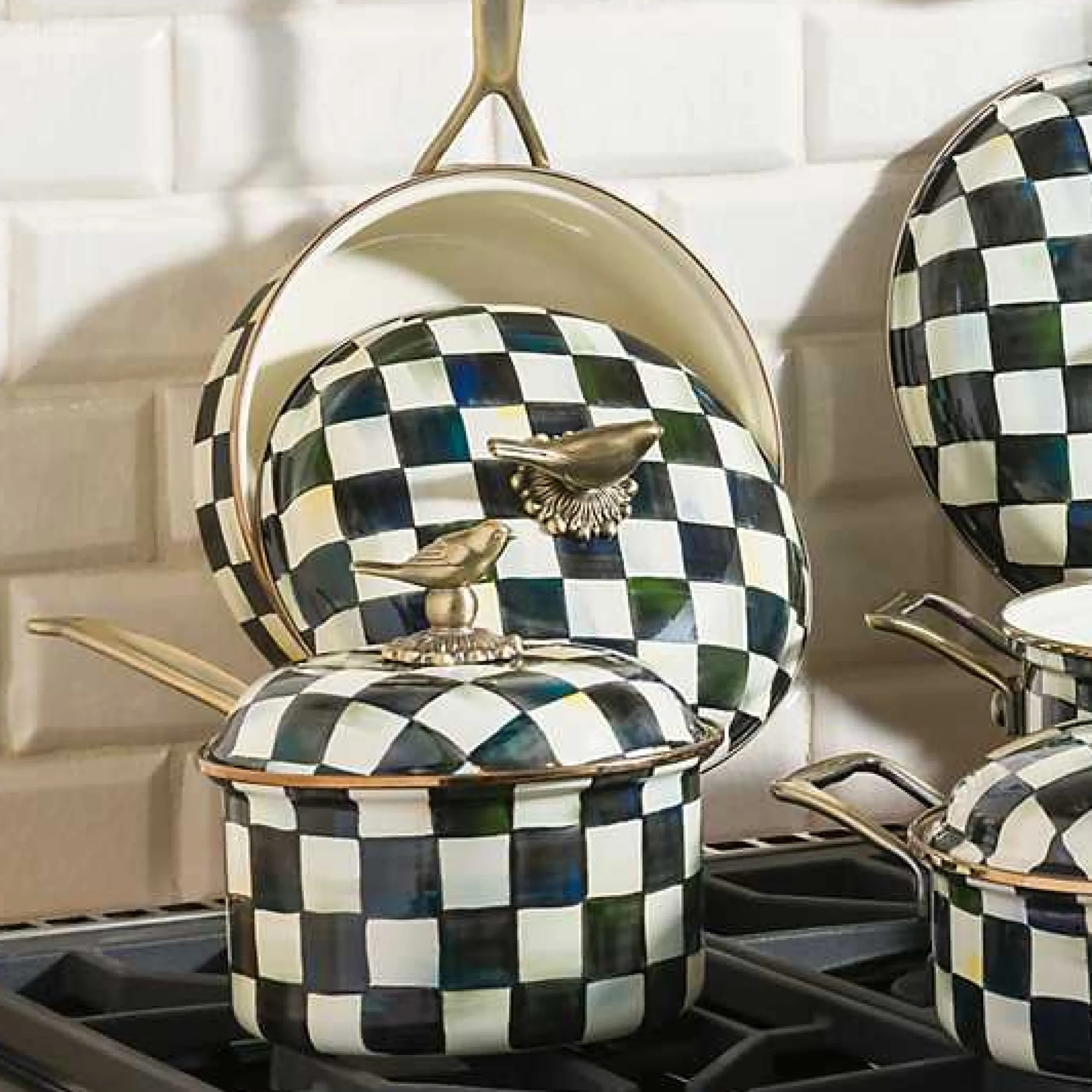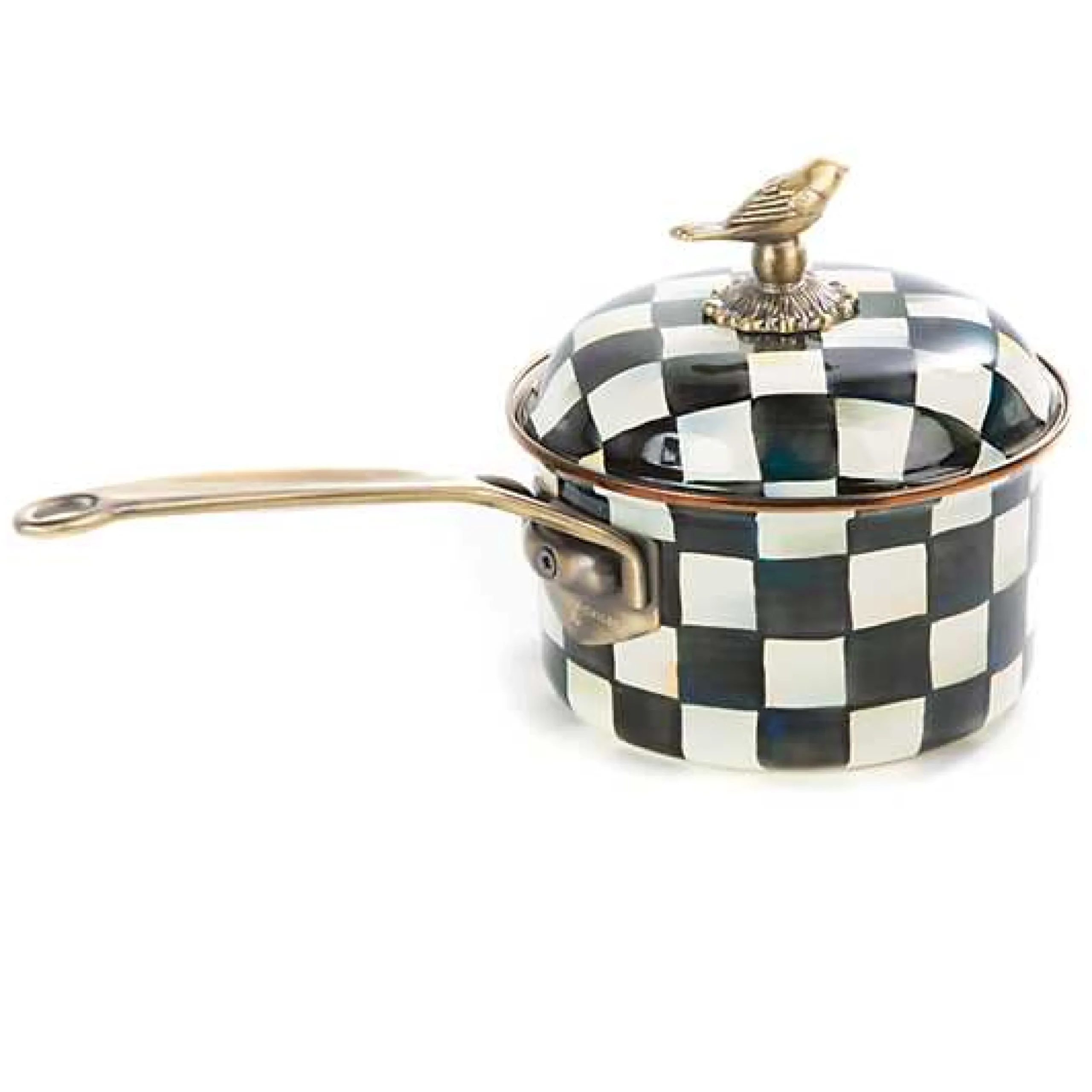 From stovetop to tabletop, our Courtly Checkreg; Enamel 2.5 Qt. Saucepan transitions with more than a dash of panache. Imagine how your signature sauces will stand out when served up in a dish bedecked with our signature black and white pattern. And to top it all off, a sweet sparrow serves as a delightful knob, as unique as it is useful. MacKenzie-Childs