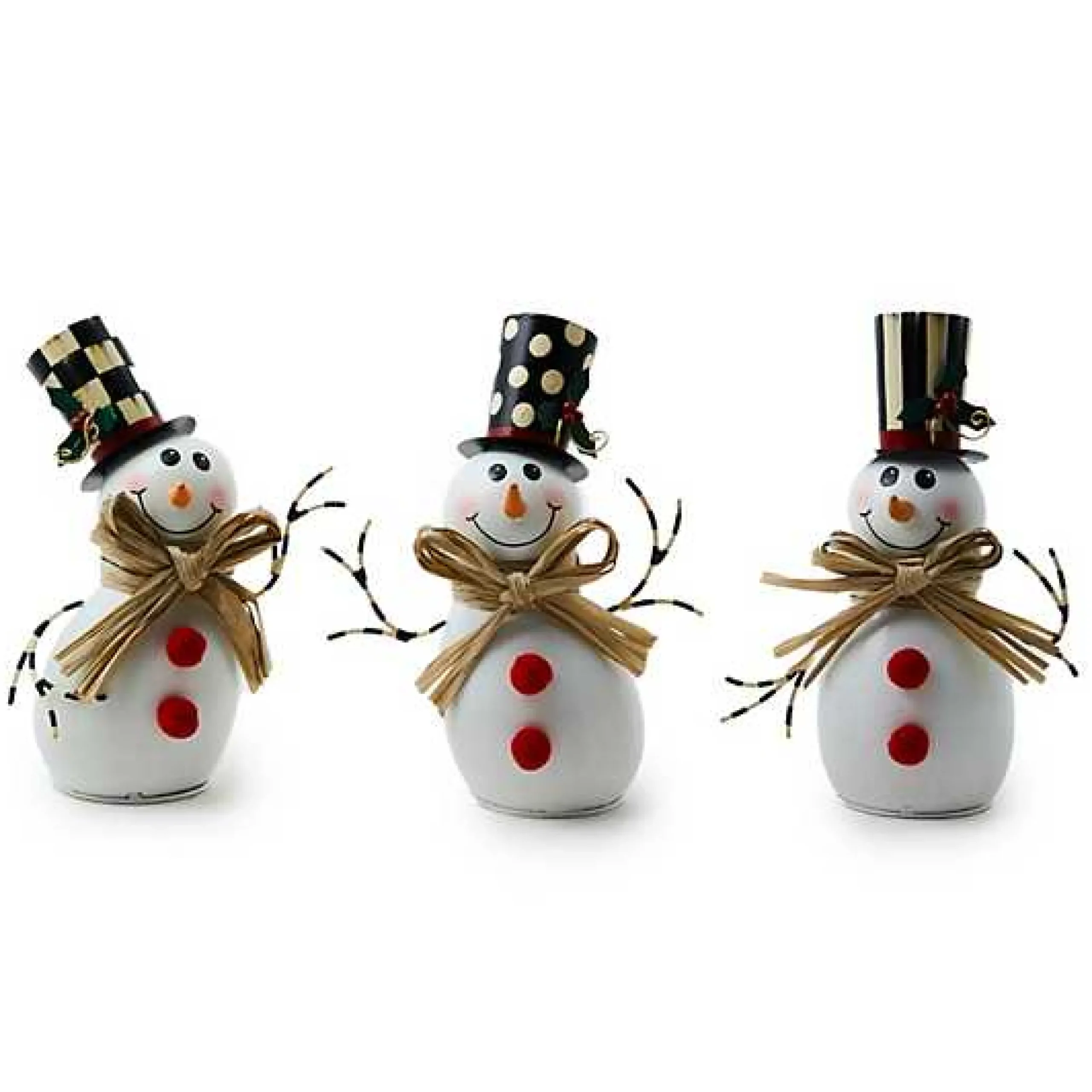 This set of three hand-painted tin snowmen is snow much fun. Each wears a different Courtly hat, trimmed with holly, and has a raffia bow tie. MacKenzie-Childs