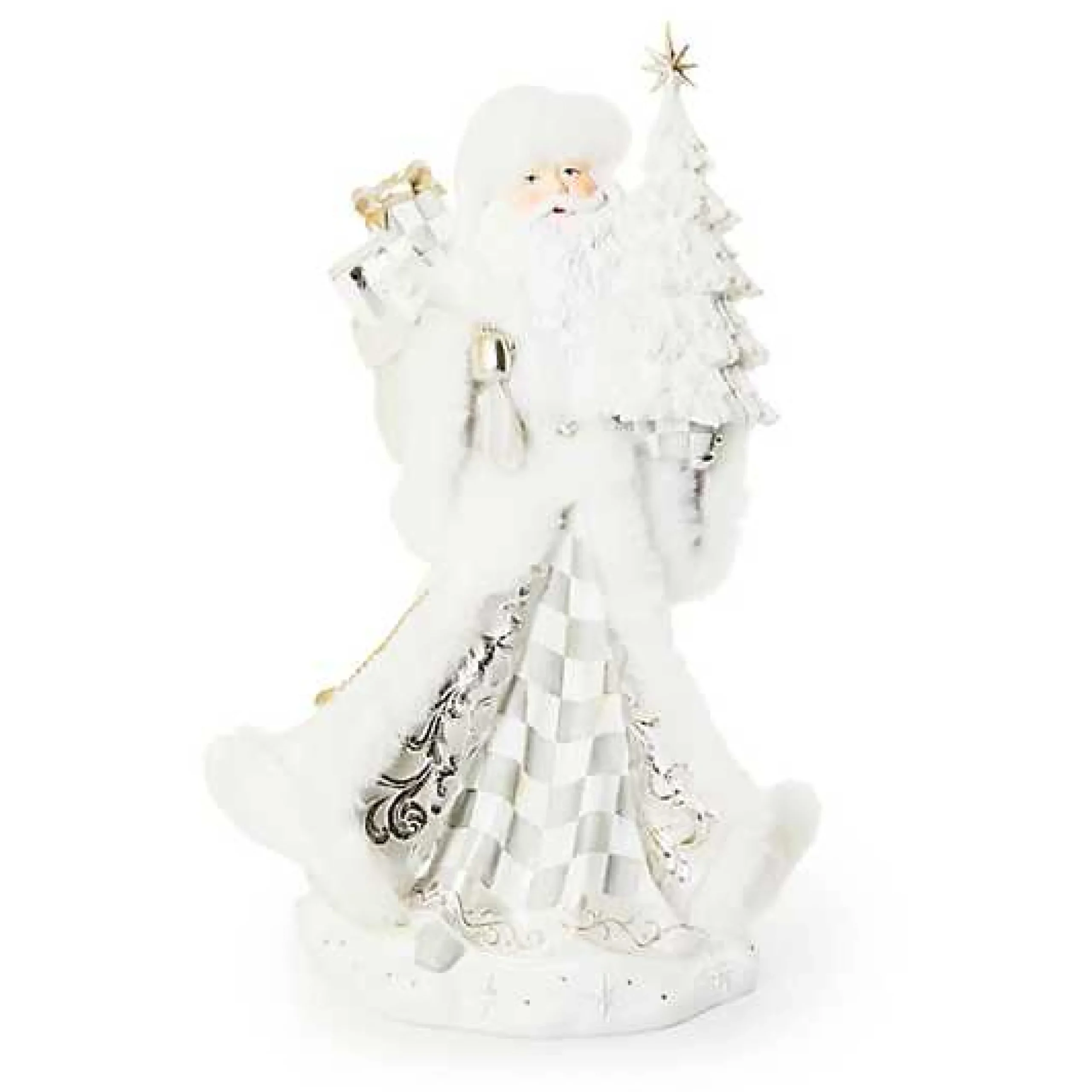 Done head to toe in winter white with accents of faux fur and Sterling Checkreg;, this hand-painted Santa comes bearing gifts in the toy sack slung over his shoulder. MacKenzie-Childs