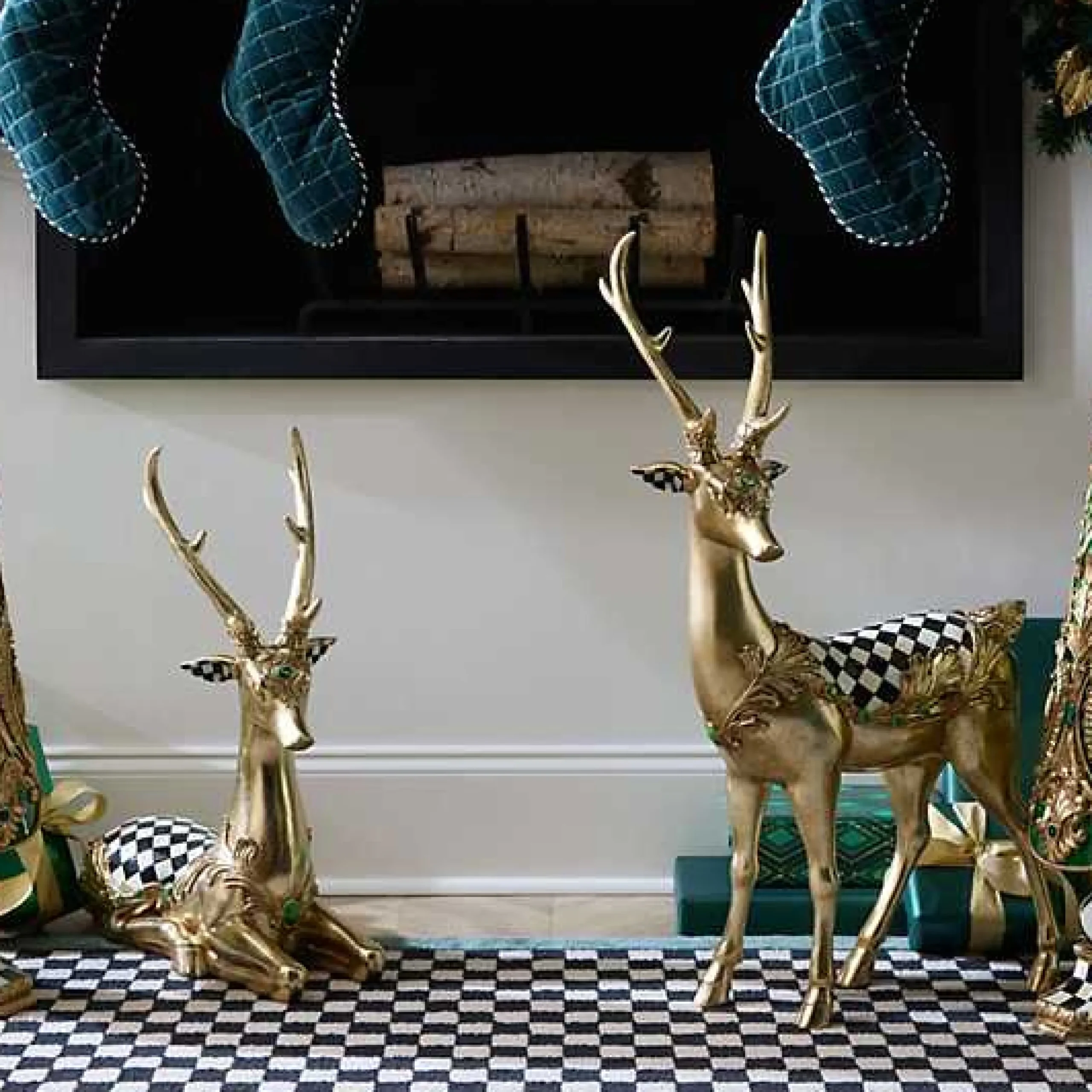 Deck the tabletops with this standing gold leaf deer wearing a Courtly Harlequin blanket that’s finished with emerald green accents.