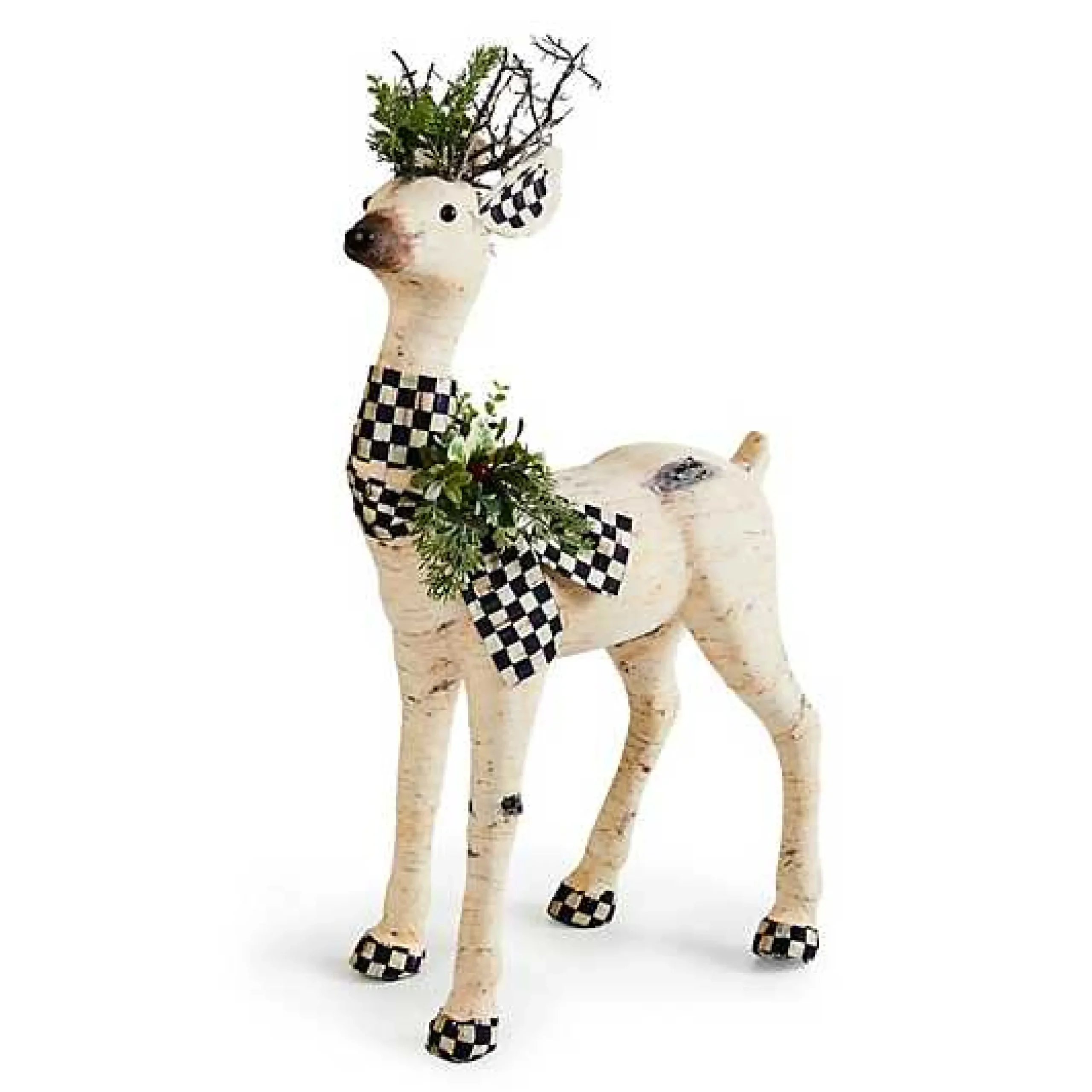 Oh, deer! Create a winter wonderland with this deer figurine with a faux birch finish that wears Courtly Checkreg; on its ears, hooves, and the bow around its neck. MacKenzie-Childs