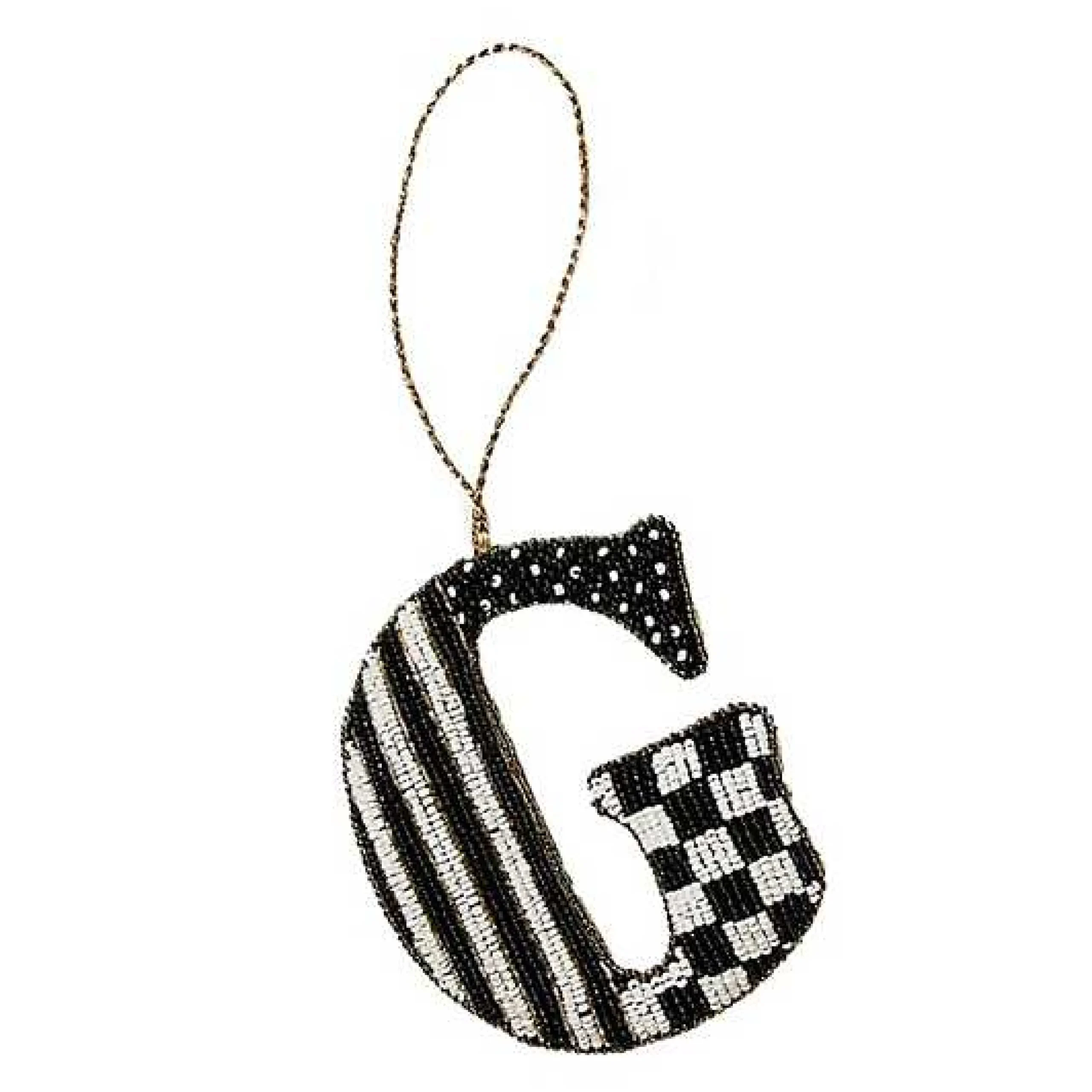 Give the Christmas tree your distinct style with this monogram ornament done entirely in black and white beads that hangs from a golden cord. Perfect for the tree, of course, and also terrific for embellishing packages, place settings, and more. MacKenzie-Childs