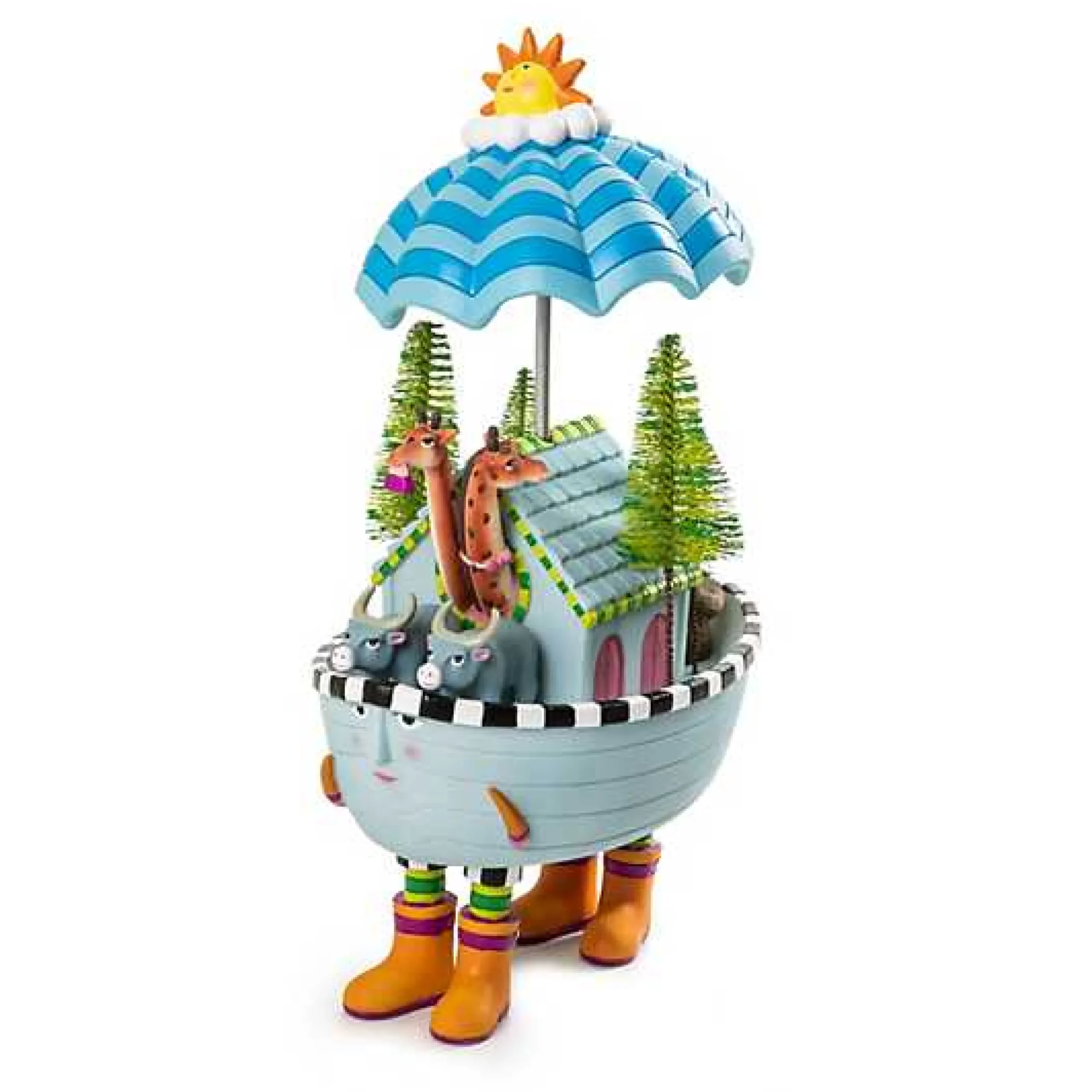 The Patience Brewster Noahrsquo;s Ark Music Box brings the biblical tale to life in a whimsical way. This hand-painted ark is detailed from top to bottom and plays ldquo;Over the Wavesrdquo; as the umbrella rotates. Displayed on the deck are two giraffes, two bulls, and several sisal trees. Add the other Patience Brewster Noahrsquo;s Ark animals for an even more delightful display. MacKenzie-Childs