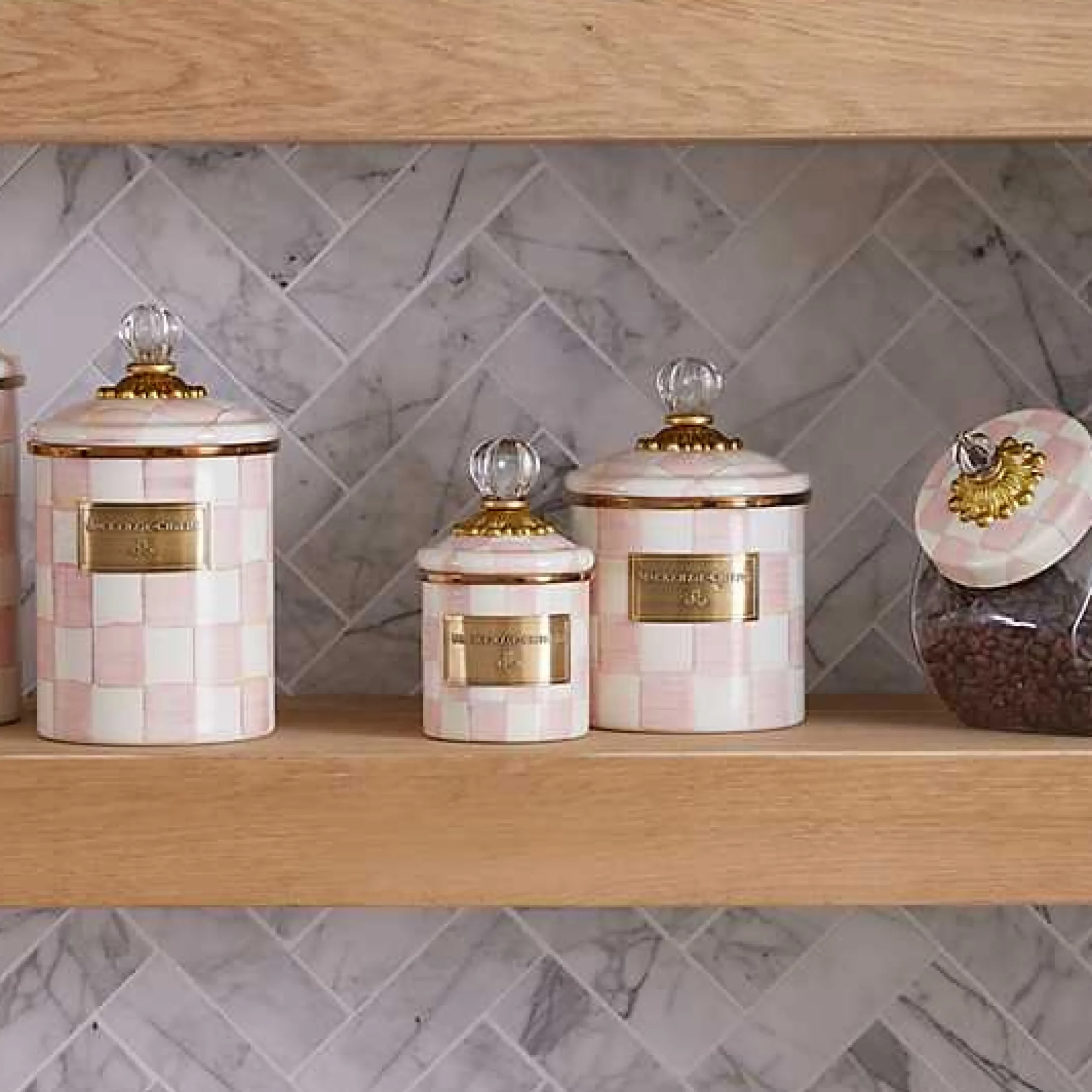 Add to the endless possibilities for our canisters with the Rosy Check Mini Canister. Our smallest sized canister, the Mini stands handsomely alone or harmonizes delightfully in a set. Keep it in the kitchen or invent new uses around the house. Each enameled steel canister is hand-painted with color-dragged checks in a range of rosy hues and topped with a glass knob. MacKenzie-Childs