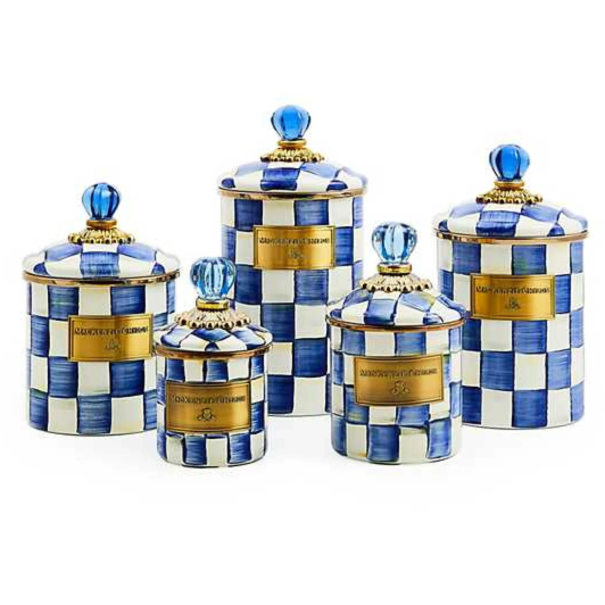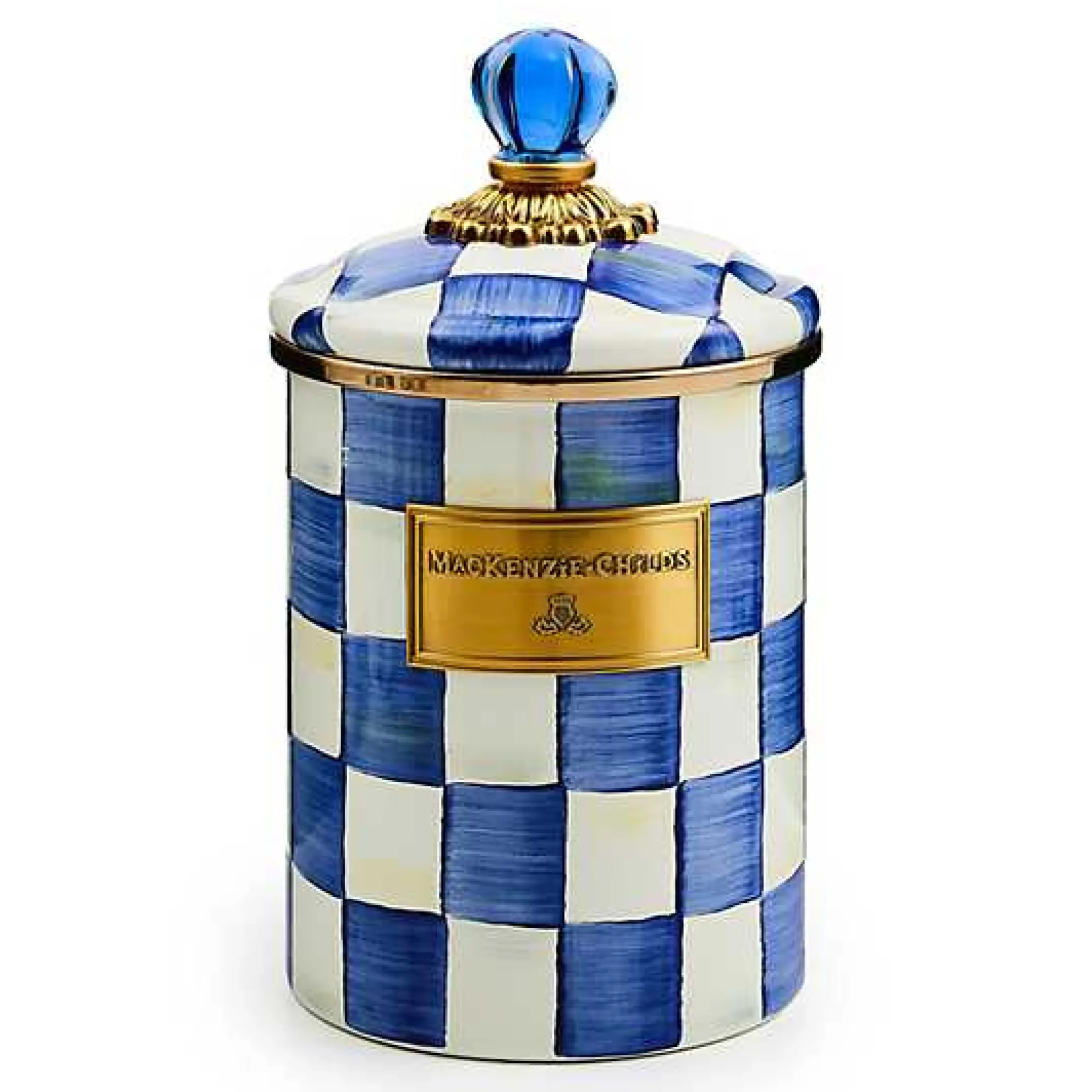 Pantry staplesmdash;flour, sugar, and coffeemdash;might seem the most obvious of contents with which to fill a Medium Royal Check Canister, but the possibilities are endless! Keep it in the kitchen with coffee beans and tea bags, cookies and candies, or dog biscuits and birdseedmdash;or invent new uses around the house. Each enameled steel canister is hand-painted with color-dragged checks in a range of blue hues and topped with an elegant blue glass knob. Because each piece of Royal Check reflects the artisanrsquo;s hand, no two are exactly alike, although they all work together in perfect harmony. MacKenzie-Childs