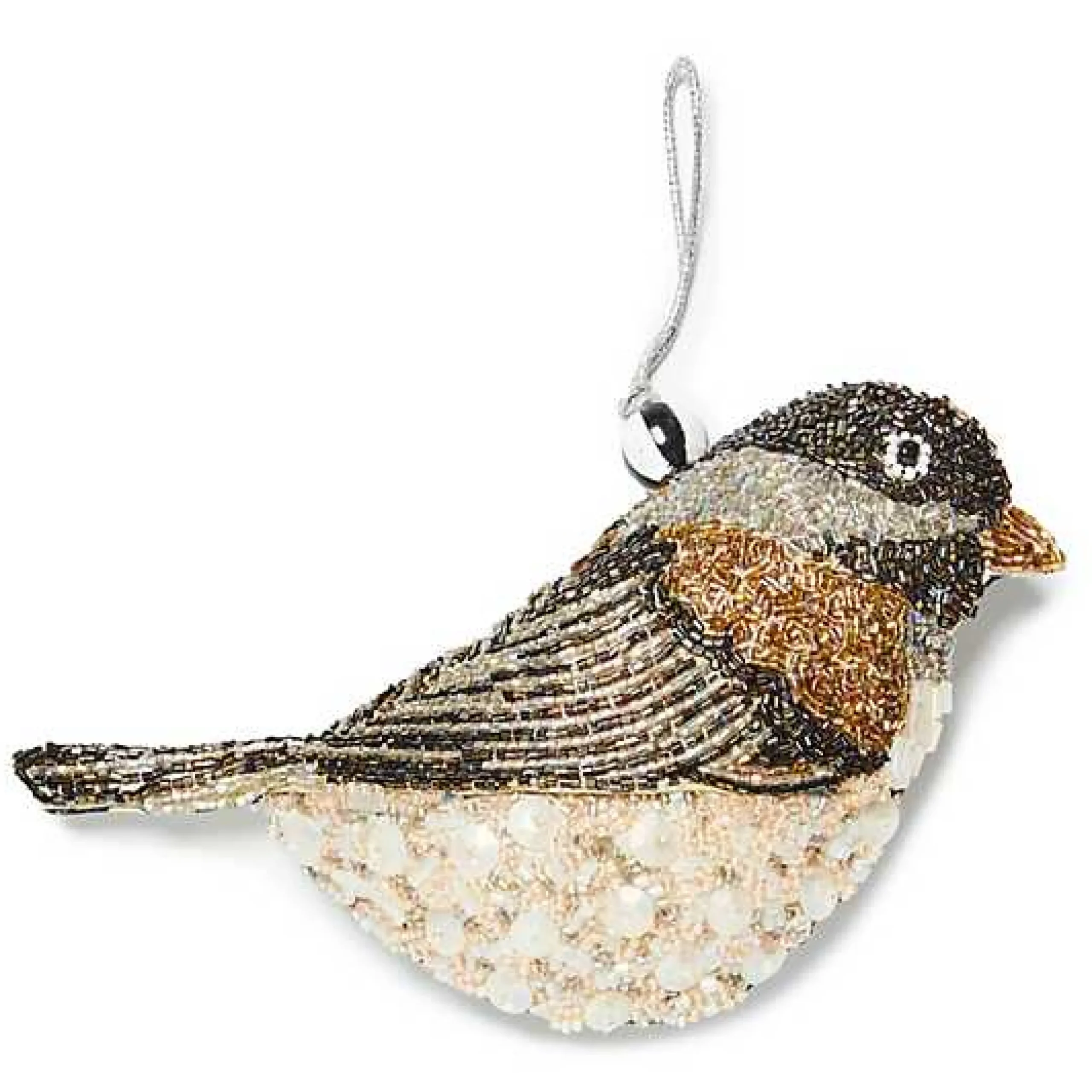 This bird ornament is a sparkling winged wonder, accented with hundreds of beads and sequins. It hangs from a silver cord thatrsquo;s trimmed with a wooden bead. MacKenzie-Childs