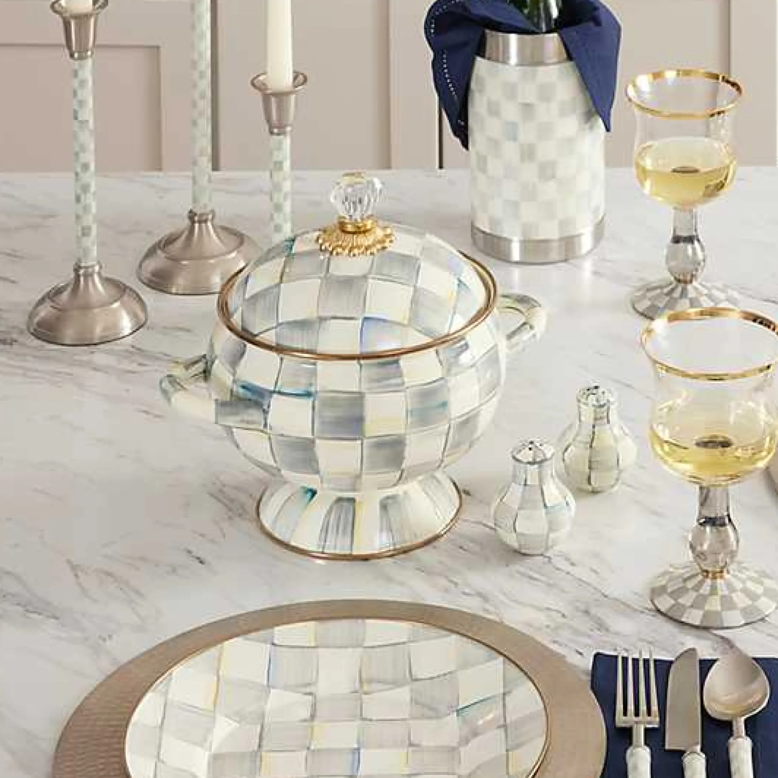 Talk about a presentation. Your soups and casseroles will be a bit grander when delivered to the table in the Sterling Checkreg; Tureen. Heavy-gauge, hand-glazed steel underbody with hand-painted Sterling Check, a bronzed stainless-steel rim, and topped off with a glass knob on the lid. Itrsquo;s a must-have for everyday use or for parties. MacKenzie-Childs